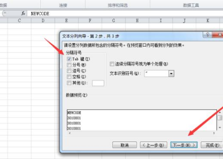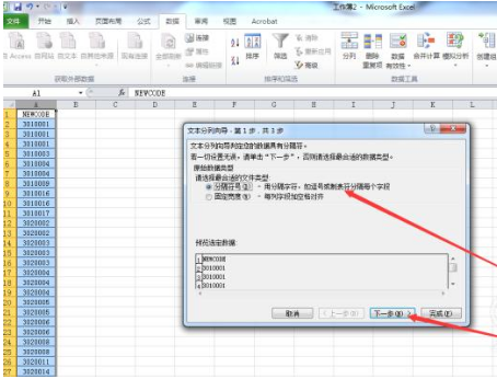 点击“分列”以后,我们出现以下的对话框,我们按照如下图所示,选中第一个“分隔符号”,接着,我们点击“下一步”,具体步骤如下图。