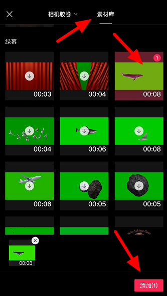 进入以下界面,点击“素材库”,如图,选择一个绿幕素材,点击“添加”