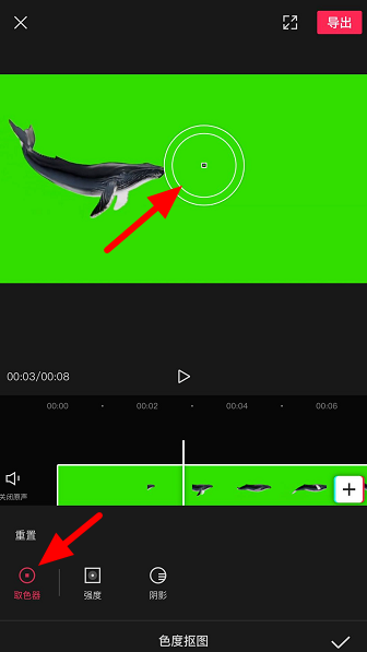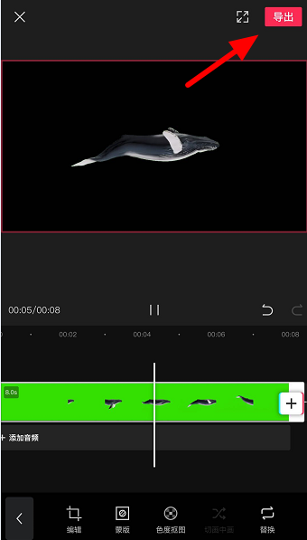 素材添加成功,进入剪辑窗口,点击视频轨道,左滑工具栏,选择“色度抠图”