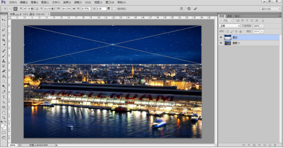 2. 夜景图导入后,再通过菜单栏“文件”中的“置入”将星空素材导入。导入后,根据天空的比例调整它的位置,调整完成后,按一下键盘回车键。