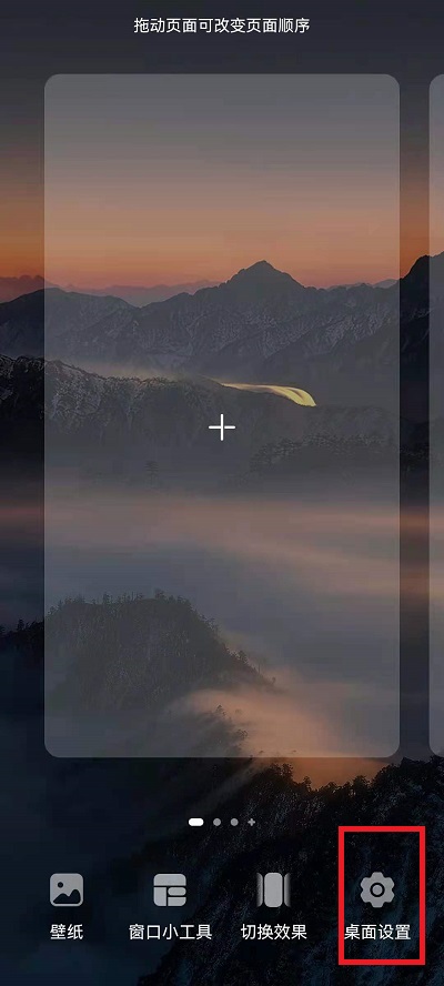 1、最快的方式就是使用两个手指在手机桌面向中间捏,然后就会出现设置以及各种功能,然后用户需要点击下方的【桌面设置】;