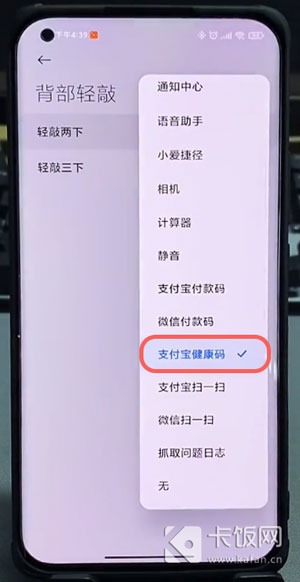 6、最后选择需要打开的功能设置为【支付宝健康码】,目前暂不支持微信健康码。