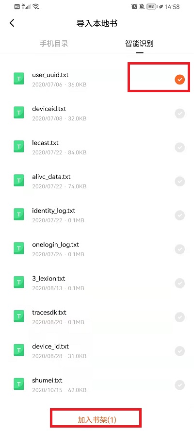 5、在智能识别中,点击选中小说,然后点击下方的【加入书架】即可完成导入教程。