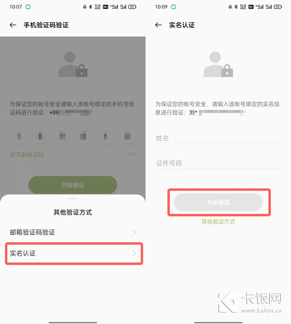 6、实名认证:在手机号码验证界面点击【其他验证方式】选择【实名认证】,然后输入账号实名认证的信息,点击【开始验证】;