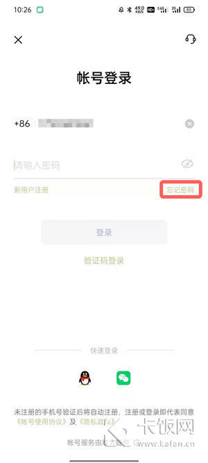 2、在账号密码登录界面,点击密码右下角的【忘记密码】;