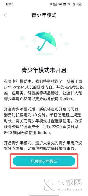 4、进入青少年模式设置后,点击下方的【开启青少年模式】按钮;