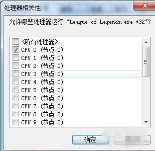 03 在设置相关性界面中,我们可以看到当前已有的CPU数量,我们将CPU全部取消,只留下CPU0然后点击确定,切换回游戏。