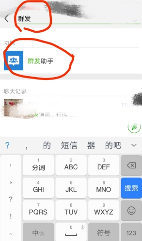 02 在搜索框中输入群发后,找到群发助手并点击,