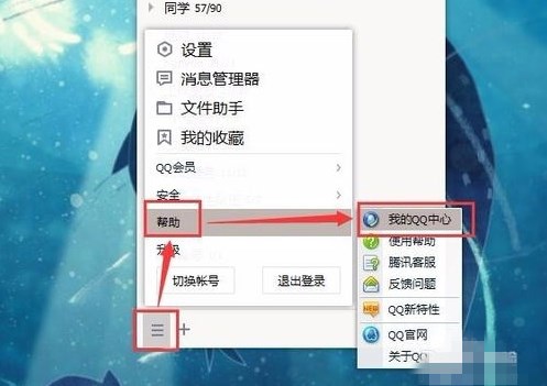 1、点击qq面板左下角的帮助菜单进入我的QQ中心