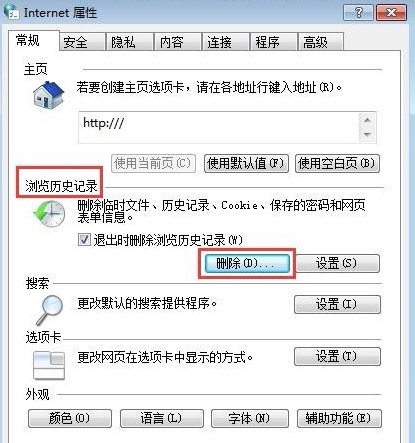 02打开internet属性,点击删除浏览历史记录,