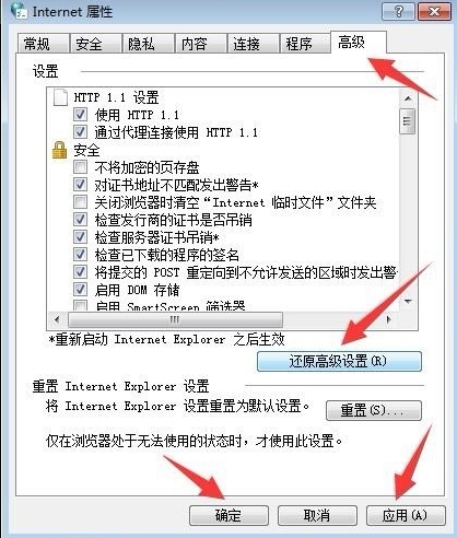 4、再点击高级,选择还原高级设置,点击应用