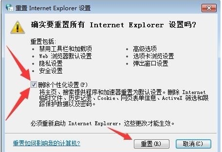 5、点击重置internet Explorer设置,勾选删除个性化设置
