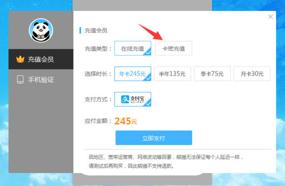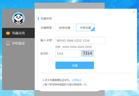 4、依次输入体验卡的卡密,验证码,卡密充值成功后,返回登录界面,就可以登录啦。