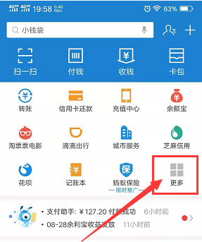 2、在支付宝首页中,找到更多按钮。