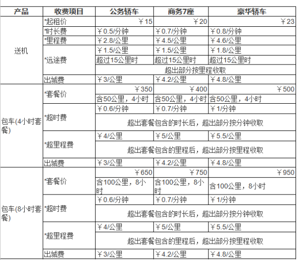 2.商务7座:别克GL8或类似7座车型,起租价是:¥20 起租价+¥0.7/ 分钟+¥4.5/ 公里。