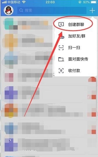 02点击打开+号,会弹出一个选项框,第一项就是创建群聊,