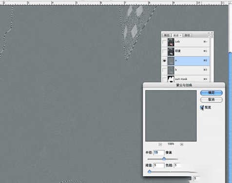 3.同理模糊b通道,一些块状色斑一会使用工具箱中的修复工具恢复,先除去大部分彩色条纹。