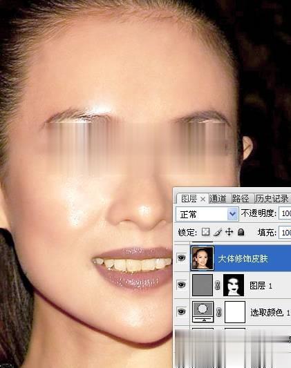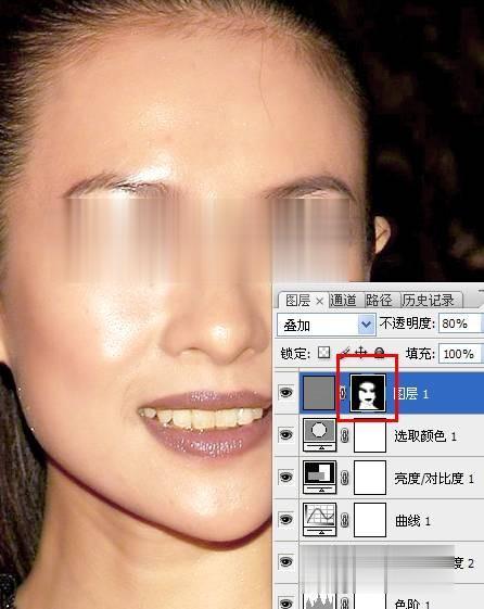 9、蒙版添加好之后,使用橡皮擦,把人物的皮肤部分擦出来,注意眼睛和嘴唇的部分,保持锐利,不需要磨皮。使用橡皮擦的时候,注意吧前景色设置为黑色,背景色为白色。