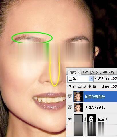 11、接着使用【图章工具】把脸上的油光处理一下,注意眉毛的地方,不要处理的太假就可以了。之后还要对细节再次处理的。鼻梁上的油光处理的时候,要注意鼻子的高光部分,不要一点高光没有那样鼻子就不好看了。