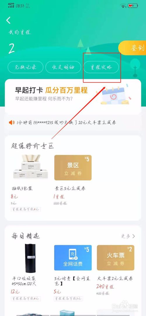 4、登录好以后在左上角有一个写着签到赚里程的一个图标,点击打开。
