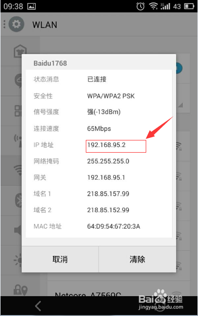 6、弹出一个WiFi的连接的状态的信息,可以看到所连接的WiFi的IP的地址。