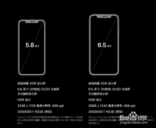 4、屏幕方面:尺寸分别是 5.8英寸和6.5英寸,两款手机保持同样的458ppi,iPhone 11 Pro Max的分辨率自然更高。