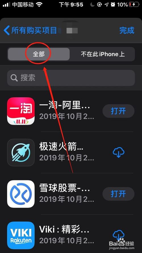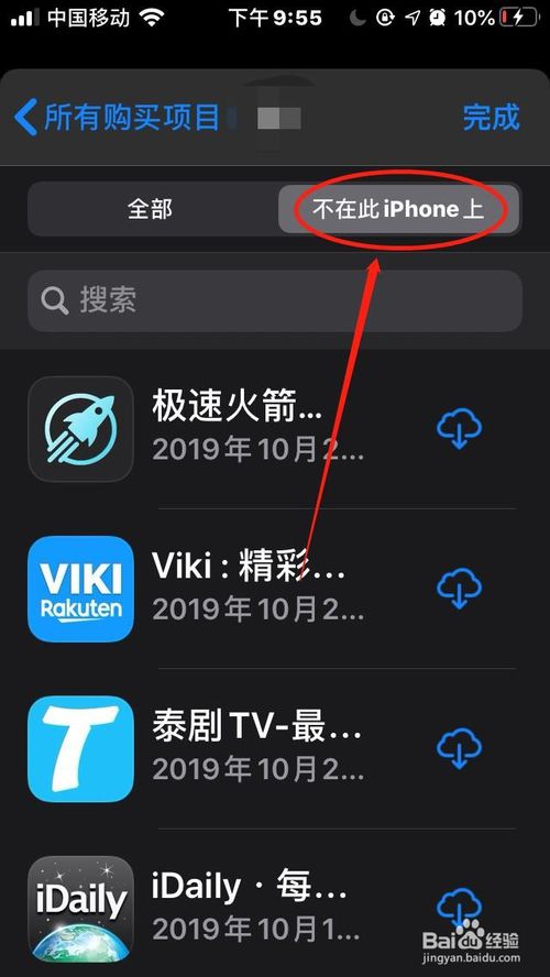 5、在”我的购买项目“中,点击”全部“可查看所有购买项目,包含已经卸载的项目。点击”不在此iPhone上“,可查看过去购买过,但已经卸载的项目。