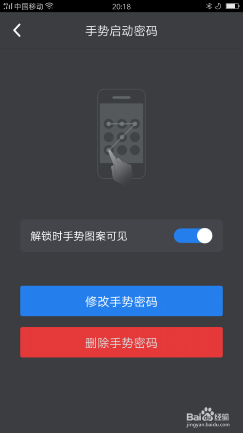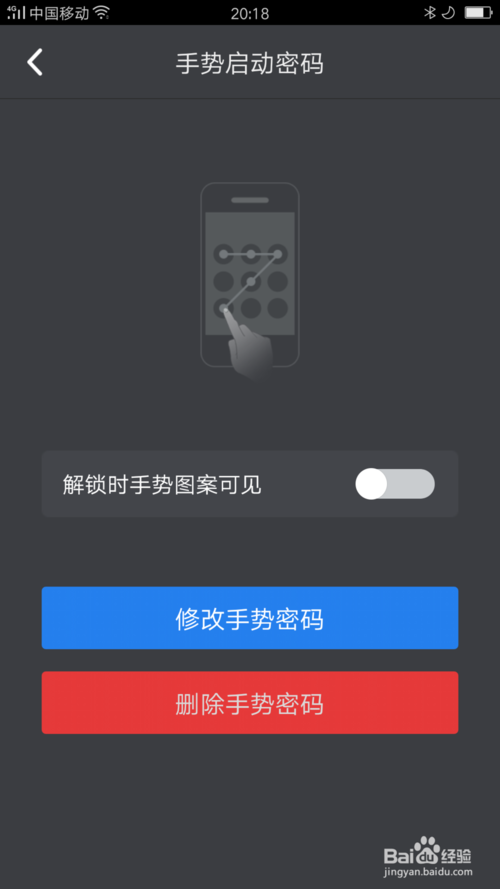 5、摁下手势启动密码,开启手势启动密码界面,关闭解锁时手势图案可见,如图