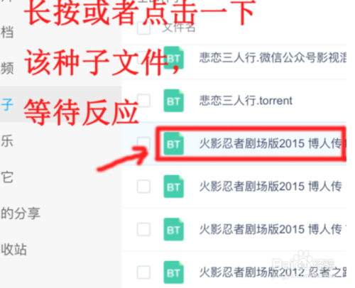 7、这个时候,我们选择一个种子文件,“长按或者点击一下,”等待它反应;