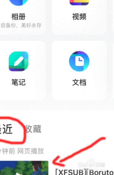 6、登录“百度网盘app”以后,我们会发现在“首页”界面有一个“最近”的提示,显示2分钟前 网页播放……这个时候,我们只需要点击一下“网页播放的内容”即可;