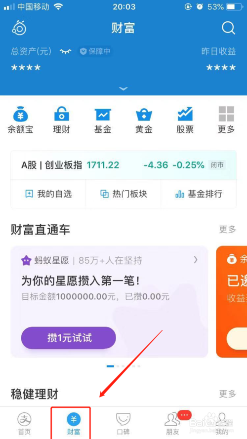 1、打开支付宝app,点击软件页面左下角“财富”。