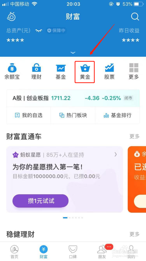 2、在打开的“财富”页面,找到“黄金”,点进去。