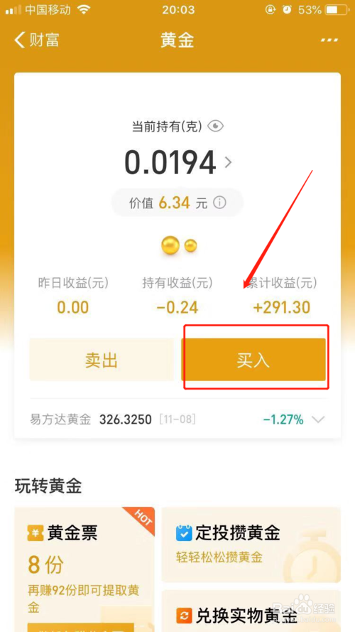 3、最后,在打开的“黄金”页面,点击“买入”即可,不想持有了,点击“卖出”即可。