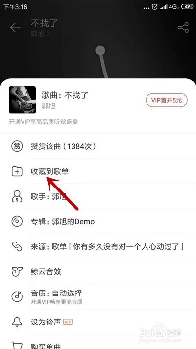2、在歌曲详情界面,点击【收藏到歌单】。