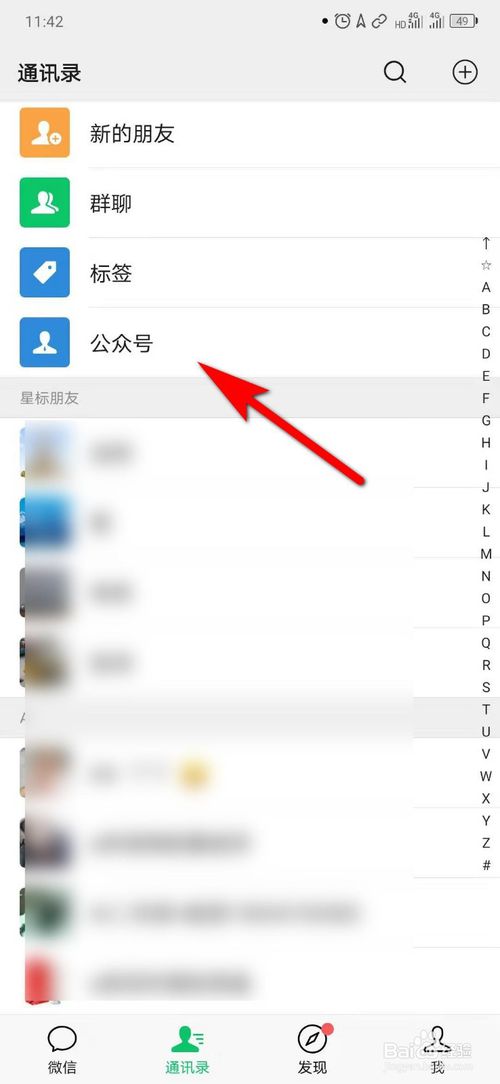 1、在手机微信通讯录界面,点击“公众号”;