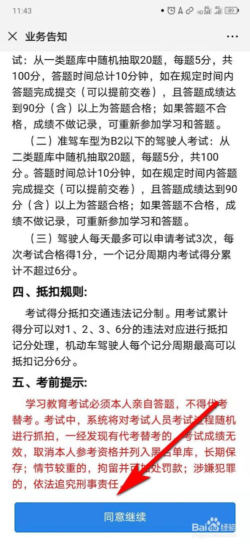 6、在业务告知界面,点击“同意继续”答题通过即可得到积分奖励,可抵扣驾驶证记分